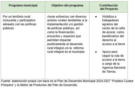 Los resultados del proyecto de investigación han permitido visibilizar a los cortadores manuales de caña como sujetos beneficiarios del derecho al acceso a la tierra regulado de forma particular en el artículo 64 de la Constitución Política de Colombia. Con esta clarificación, los esfuerzos a los que se refiere el programa deben articularse para contribuir a hacer efectivo el art. 4 del Decreto Ley 902 de 2017, que reconoce como sujetos de acceso a tierra y formalización a título gratuito a los trabajadores y trabajadoras agrarias. Estas acciones son pertinentes porque los trabajadores agrarios de corte de caña carecen de alternativas para mejorar sus condiciones actuales en cuanto a acceso a empleo y su bienestar subjetivo se ve afectado por el trabajo tan exigente que realizan.