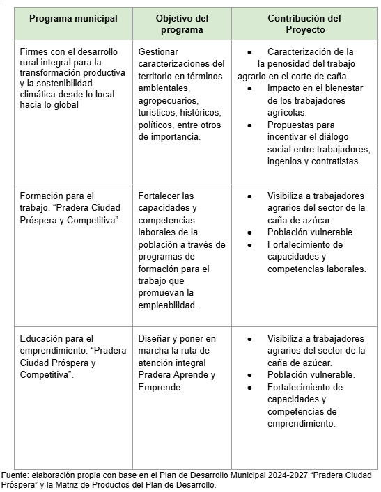 En nuestro caso, ejecutamos durante el año 2024 el proyecto “La penosidad del trabajo agrícola, del sector agroindustrial de la caña, y su impacto en el bienestar de sus trabajadores en Pradera, Valle del Cauca”, financiado por el Ministerio de Ciencia Tecnología e Innovación de Colombia, en el marco de la Convocatoria Orquídeas, mujeres en la ciencia: Agentes para la paz (núm. 935/2023). Este proyecto se formuló en el año 2023, atendiendo a la relevancia socio-económica que tiene el sector agroindustrial de la caña de azúcar en el municipio y que se reconocía como tal en el Plan Municipal de Desarrollo del Municipio de Pradera vigente en esa época, y que se reitera en el Plan Municipal de Desarrollo vigente “Pradera Ciudad Próspera” (2024-2027).
